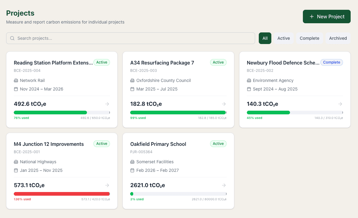 The only UK platform with dedicated project-level carbon tracking for construction. Track emissions across six construction-specific categories, set carbon budgets, manage project teams, and generate per-project compliance reports.